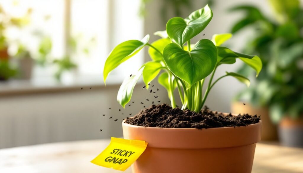 - Yellow sticky traps and apple cider vinegar traps provide immediate reduction of adult gnats while soil treatments work, though these methods must be paired with larval control to break the reproductive cycle.