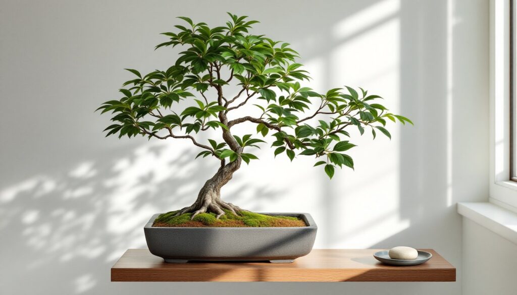 Placement: Choose a single focal point rather than scattering plants throughout a room. A bonsai on a tokonoma-style shelf (a recessed alcove or simple floating shelf 36 to 48 inches off the floor) draws the eye and creates a meditation point. Pair it with a neutral backdrop, white or light wood walls, to emphasize form. According to design resources like Better Homes & Gardens, restraint in plant placement often has more impact than abundance.