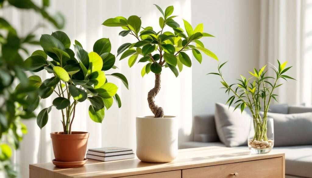 - Placement matters for both aesthetics and plant health: jade plants thrive in bright south- or west-facing windows, while lucky bamboo tolerates low-light areas like home offices or bathrooms.